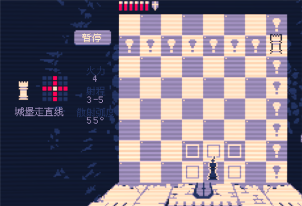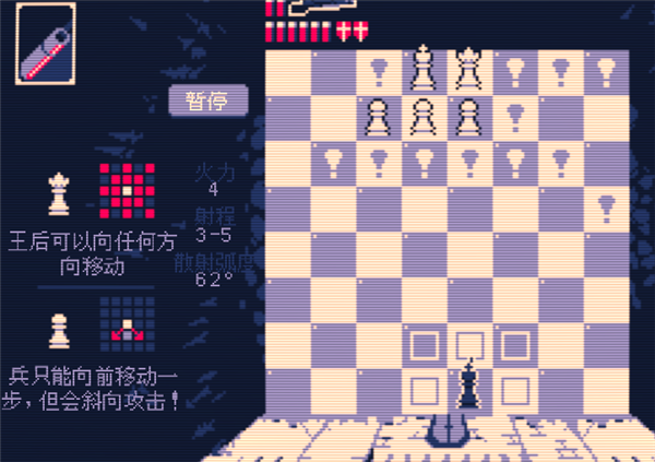 2、策略与射击:每一回合,你可以选择移动你的国王或射击敌人的棋子。之后,你需要再次移动来给霰弹枪装弹。避免被对方将死,同时寻找机会杀死敌方的王,完成每一层的关卡挑战。