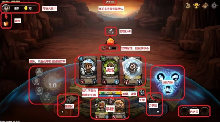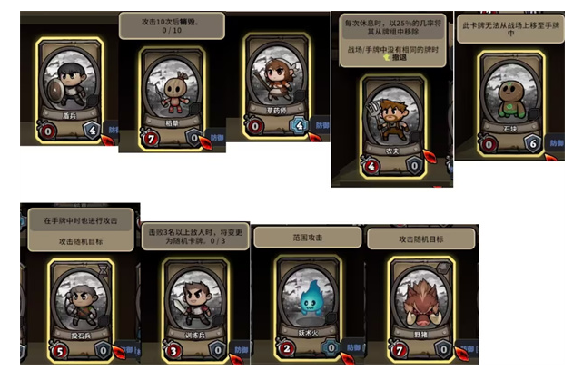 2、战场上场卡牌,左下角数字是攻击力,右下角是防御力,防御分为护盾及格挡,战场中间草药师的防御标识就是护盾,右边狂战士的防御标识则是格挡。护盾能抵挡等值伤害并在本次战斗内保留,等于额外血量;格挡仅在当回合生效,但可减免敌人每次攻击,在有多个敌人攻击或敌人多段攻击时能比护盾抵挡更多伤害。