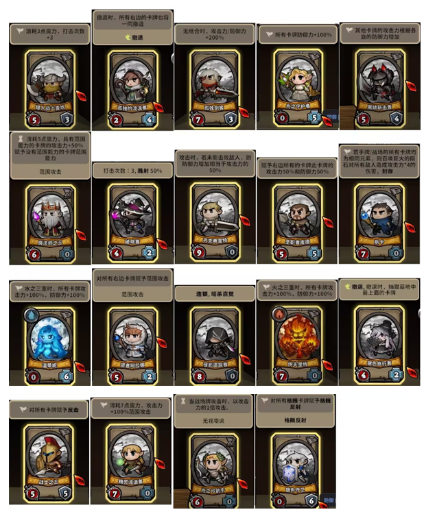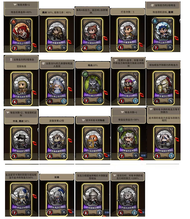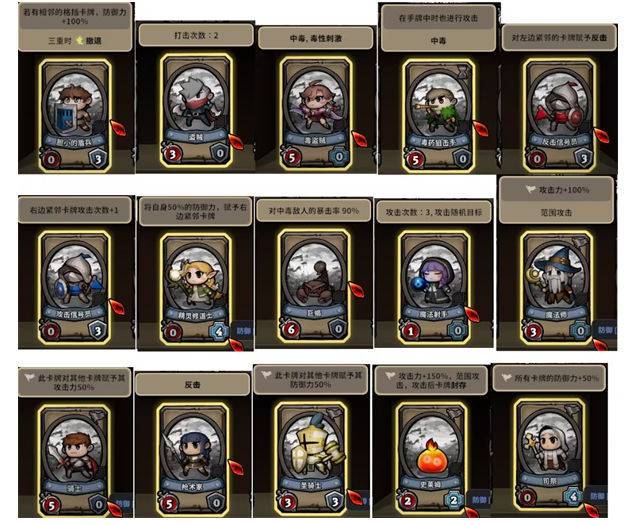 卡牌分为五个等级,从低到高分别为:普卡、银卡、金卡、紫卡和橙卡。普卡属于基础牌组中的常见卡牌,而橙卡则只能在地图中的召唤阵中获取。每张卡牌都可进行升级,升级后不仅能提升卡牌效果,还能解锁一个装备格子。