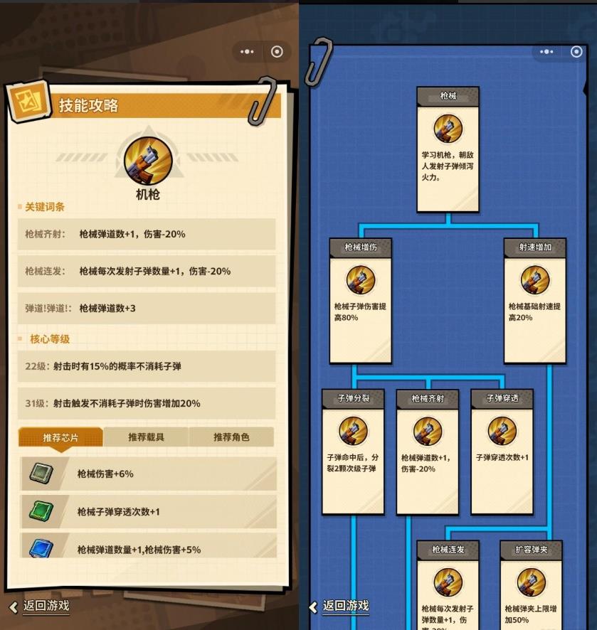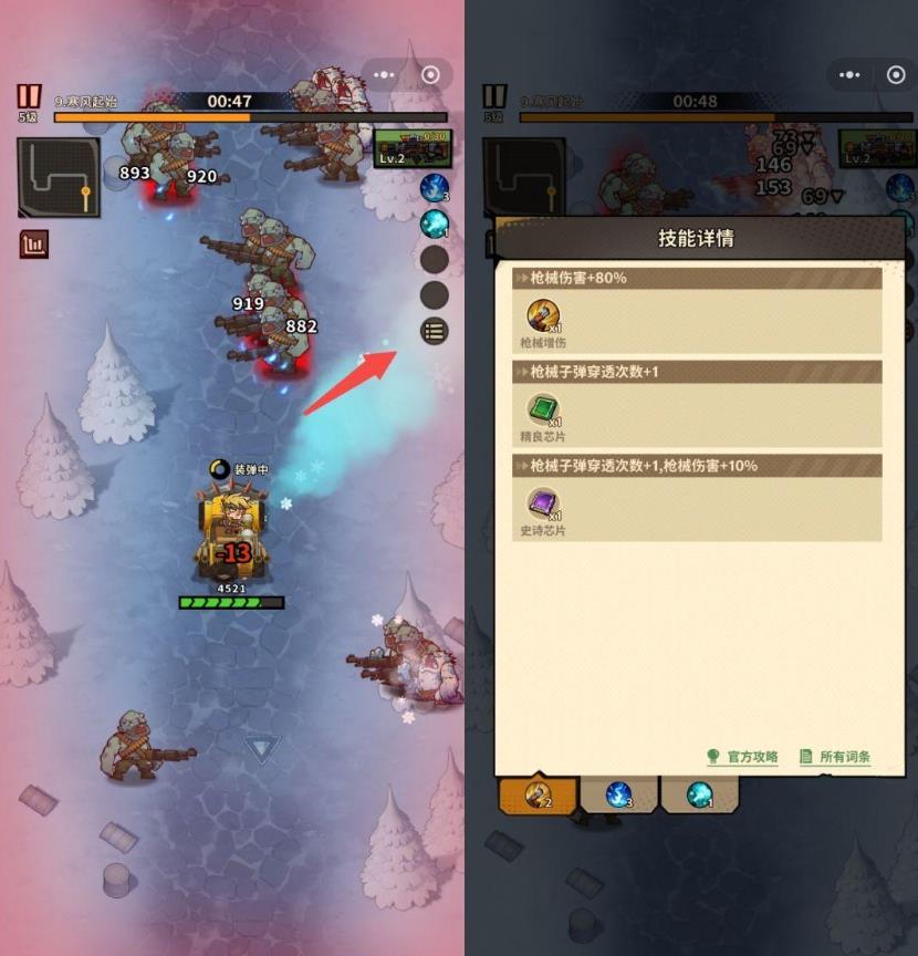 进入战斗后,记得点开右上角的技能详情,局内的技能流派一目了然。同时,别忘了点开下方的官方攻略和所有词条,在其中能够了解所有技能出现的前置条件,在选择技能的时候就能更加游刃有余!