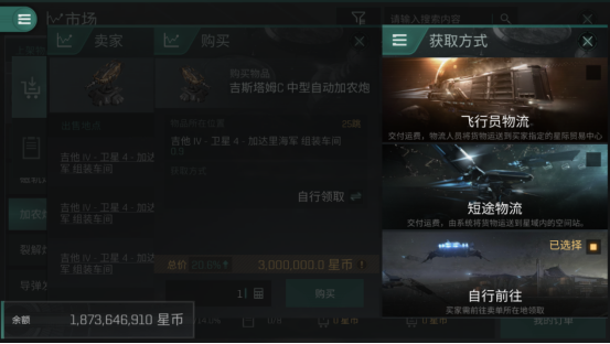市场交易是目前游戏中玩家们最常用的交易手段,我们只需要将自己的货物放在空间站,再点击出售,物品信息和售价就会直接被挂进市场的列表里,非常便捷。不过交易的物品都是卖家在哪个空间站卖,买家就要去哪个空间站拿。虽然买家可以选择物流运输,但是价格会更高,还会有被劫货的风险。所以在一些偏远星系售卖物品时,如果我们不把价格压低,那么一般都是卖不出去的。