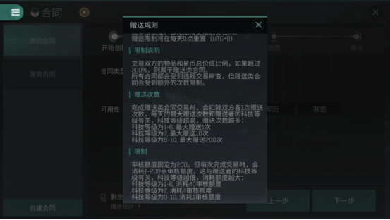 但是合同就不一样了,因为不经过市场,所以税率就会低很多。中介费和交易税分别都只有4%,但是创建时要交2.5%的定金,不过总的算下来也就少赚了10.5%,比起上架市场所最终要交的23%可是低得多了。而且最关键的是不用学习任何技能,除非是想增加合同数量上限,那就要点一下贸易学(同时还会增加市场订单的上限)。