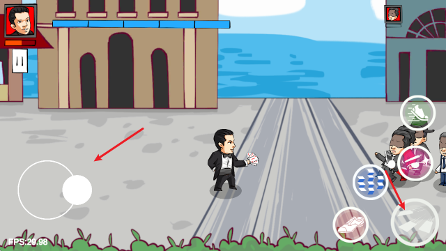 1、游戏中拖动左侧的摇杆移动,点击右侧的普攻即可发射扑克进行攻击。