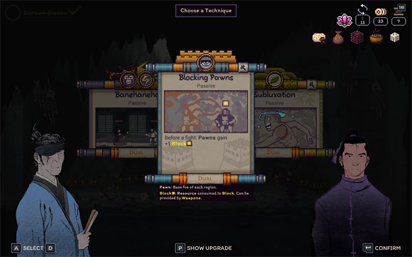 A:击败大师后学习的技能为永久解锁,死亡后在角色选择界面可见"传承印记"。通关后解锁"宗师模式",可继承全部已学技能开局,挑战更高难度。但每局获得的临时属性加成(如吃包子涨血)会清空。
