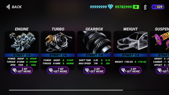 3、在比赛开始前,我们可以对车辆进行改装升级,包括发动机、刹车、喷漆、轮毂等,
