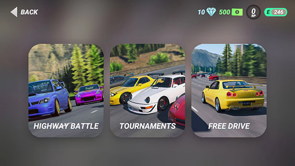 5、游戏分为【highway battle】公路战 、【tournaments】锦标赛和【freedrive】自由驾驶三种游戏模式,玩家可自行选择体验,这里以公路战为例,