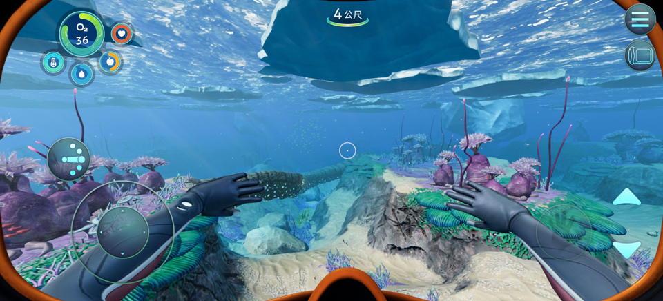 4、玩家还可潜入海中进行探索,但是需要注意左上角氧气值,在消耗殆尽前回到海上;