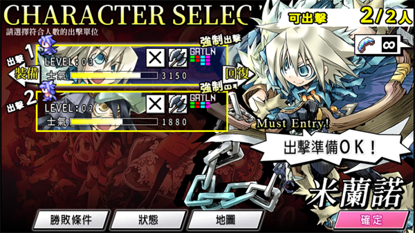 高昂(HIGH):战意变得异常高昂的状态。完全不会陷入其他异常状态,轮到我军回合时士气会全部回复。