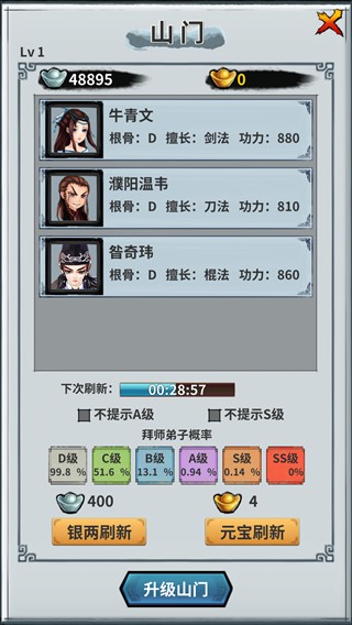 招募弟子的地方,山门等级越高招出的高资质弟子概率越高,分别有剑法,刀法,棍法,枪法,拳掌指法5种不同武学弟子根据弟子的资质分别传授不同的武学,高资质才能学高等级武学。