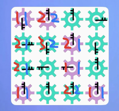 1、在玩这个游戏的时候,如果把注意力放在每个齿轮具体的转动过程上,试图想明白每一步操作的结果,那么玩到100关左右(4*4规模)的时候可能就会感到压力比较大了。