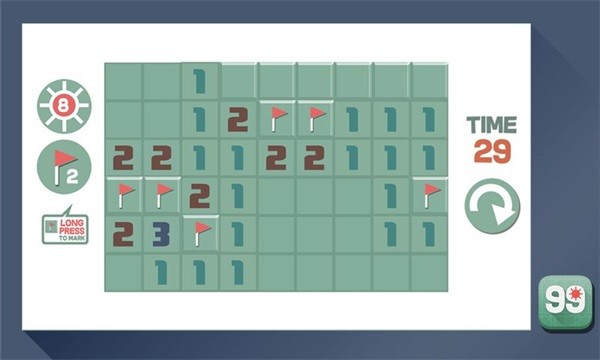 游戏中的数字表示该数字周围八格内的雷数,长按格子可以用小红旗标记轻雷。