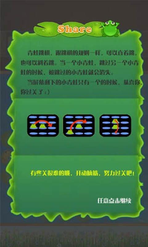 游戏规则很简单,可以直着跳,也可以斜着跳,当一个小青蛙跳过另一个小青蛙的时候,被跳过的小青蛙就会消失。当屏幕剩下的小青蛙只有一个的时候,恭喜你,过关了:)