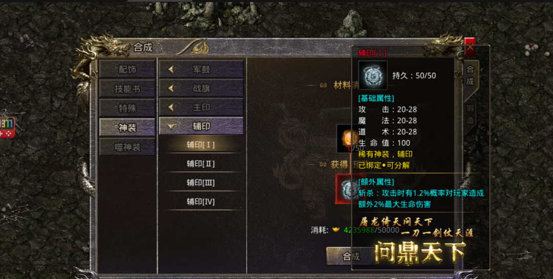 玩家佩戴辅印装备,可获得攻击、魔法、道术、生命值的属性效果,而这件装备还附带斩杀的特殊效果,斩杀效果可在攻击时,有相应概率,对玩家造成额外相应比例的最大生命伤害。